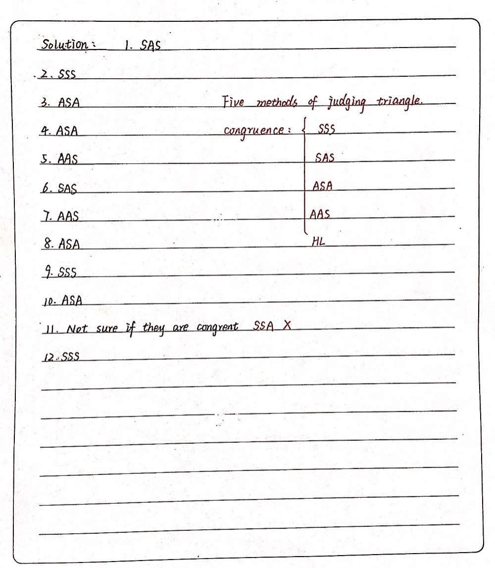 10th Grade Geometry Determine If The Triangle Is Sss Sas Asa Aas Or None Homeworkhelp from i.redd.it Sal uses the sss, asa, sas, and aas postulates to find congruent triangles. What can you conclude about two triangles if you know two pairs of to estimate the length of the tree from the ground you make the measurements shown in the figure. Use the fact that bc intersects parallel segments ab and dc to identify other pairs of angles that are congruent. You can specify conditions of storing and accessing cookies in your browser. Congruent triangles are triangles that have the same size and shape. What theorem or postulate can be used to show that. Aaa means we are given all three angles of a triangle, but no sides. This is the asa congruent case.